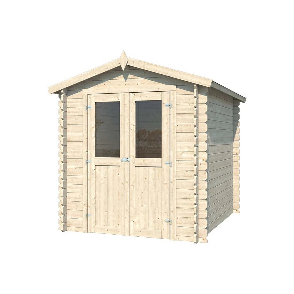 informations complémentaires : abri en madriers mi-bois provenance europe du nord , biseautés , simples rainures , bruts à lasurer de 28 m/m , porte double mi- vitrée , charnières , target pour la fermeture de la porte , dépassement de toiture vers l’avant de 10 cm , voliges de 18 m/m , feutre bitume noir , hauteur des murs 187 cm , hauteur au faitage 214 cm , vitrage verre
