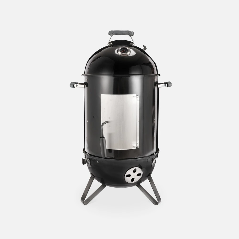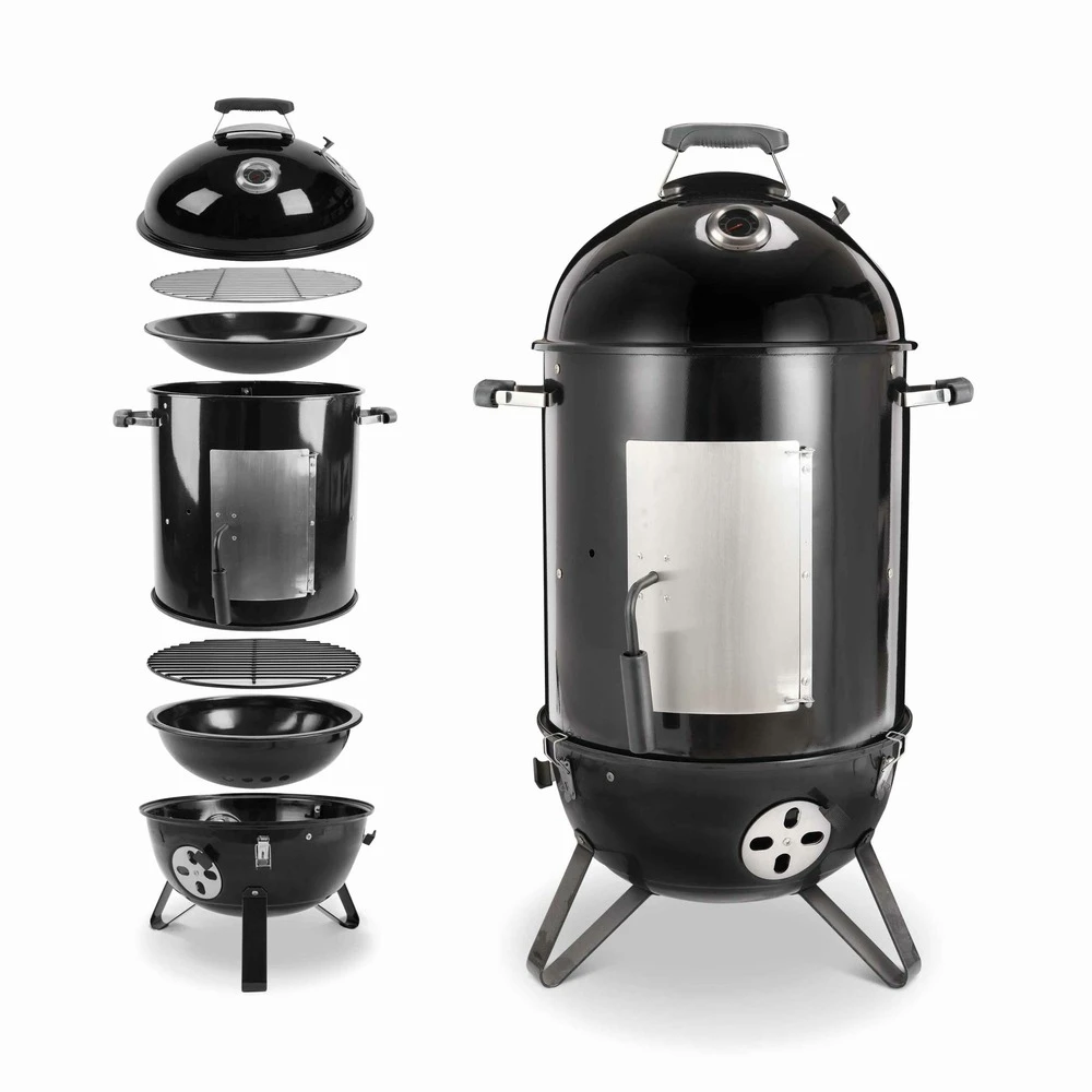 le barbecue est divisé en 3 : la cuve à charbon pour la chaleur, le compartiment de fumage et le capot. La chambre de fumage se pose sur la cuve. Il y a également 2 grilles de cuissons, et 3 crochets (sur le capot). A vous d’opter soit pour le fumage à plat soit pour le fumage vertical. Les grilles de cuissons peuvent être utilisées en même temps afin de préparer des plats pour plusieurs personnes. Bien sûr, une cuisson traditionnelle de barbecue est également possible, en retirant le récipient avec le liquide pour que les aliments soient en contact direct avec la chaleur.