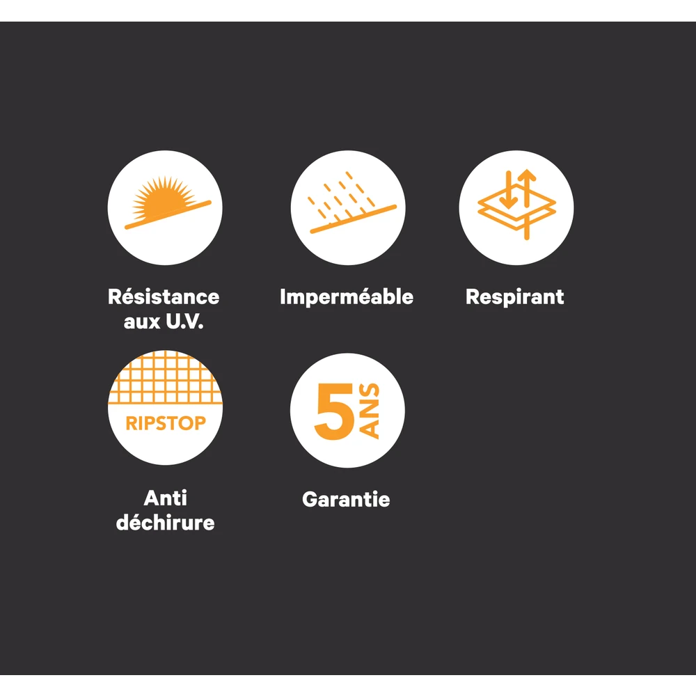 Nettoyer avec une brosse à poils doux et du savon. Ne jamais employer des produits nettoyants chimiques agressifs. Rincer à l’eau claire. Éviter l’usage d’un nettoyeur à haute pression. Laisser sécher. Remarque importante : la housse ne doit jamais être rangée humide, mais toujours intégralement sèche, au risque de voir apparaître de la moisissure.