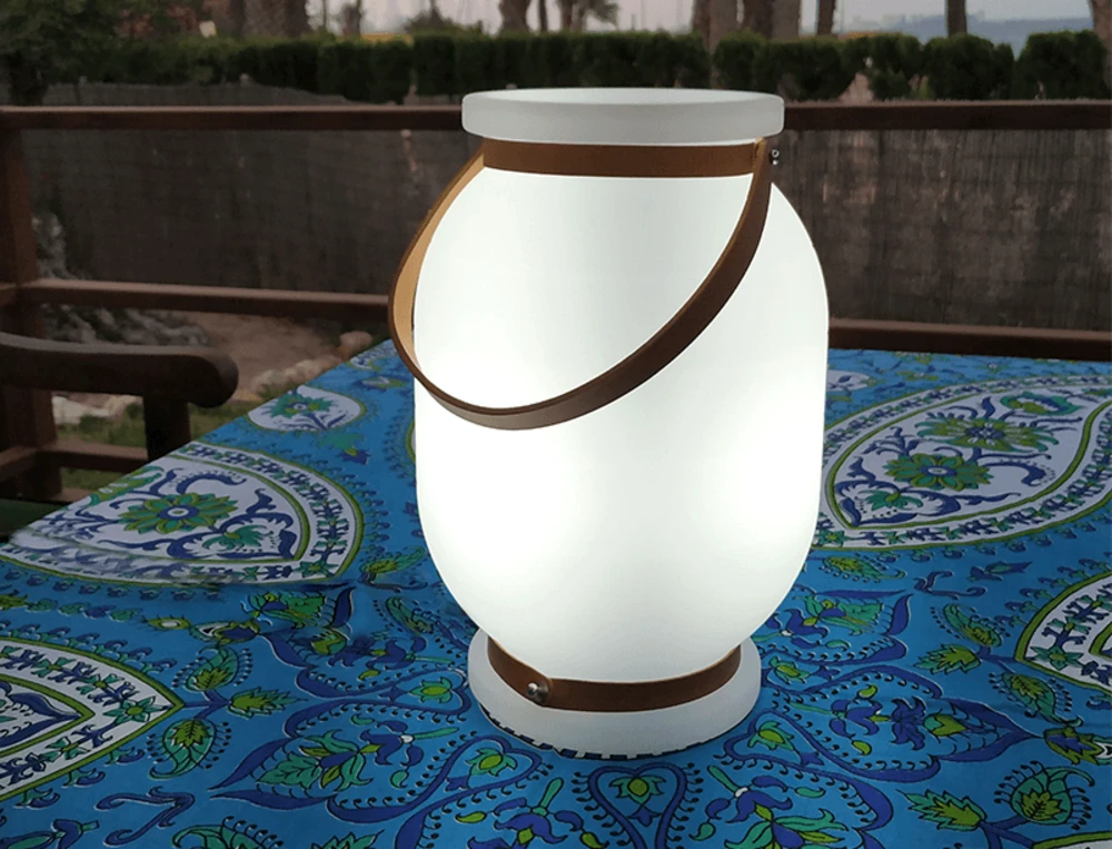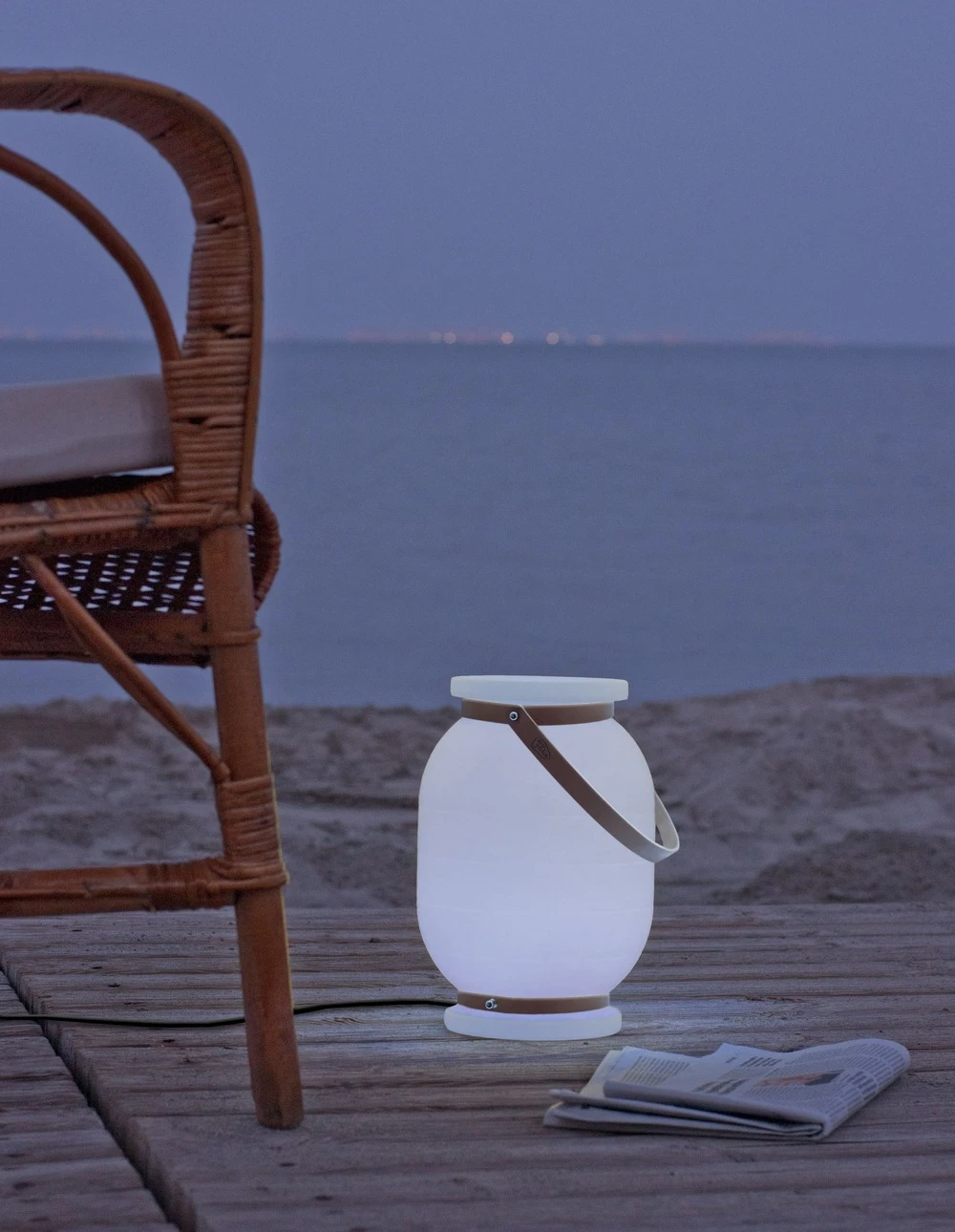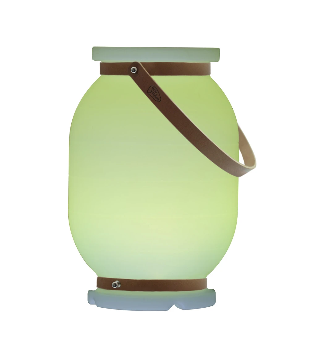 candela est une lampe nomade fabriquée par newgarden en polyéthylène et agrémentée d’une poignée en cuir vegan pour faciliter son transport.