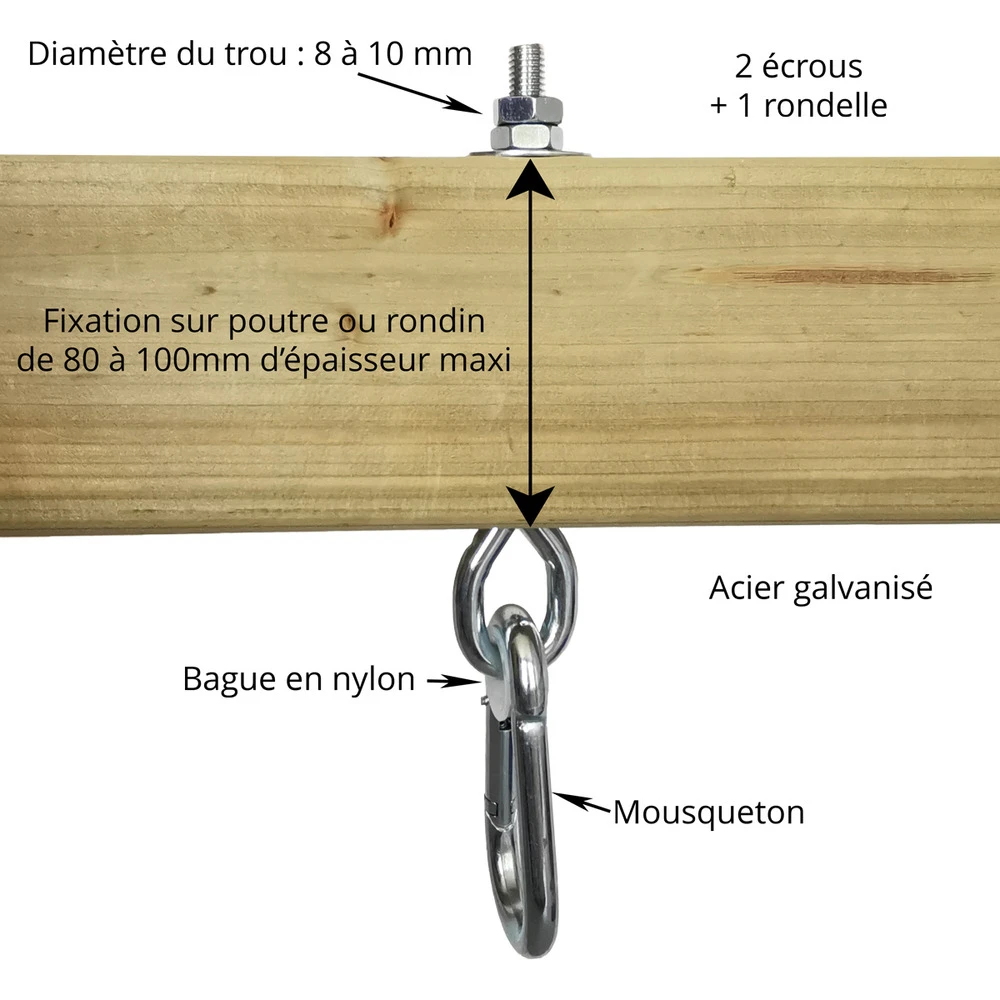 idéal pour accrocher vos agrès supplémentaires sur un portique existant et par exemple alterner entre 2 balancoires et une balancoire nid sur notre modèle woodi 🙂