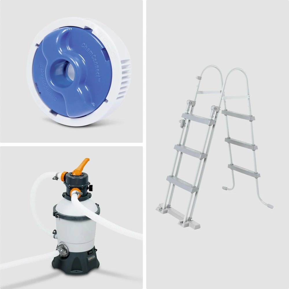 fournis : une piscine, une pompe de filtration, une échelle, une bâche, un diffuseur chemconnect